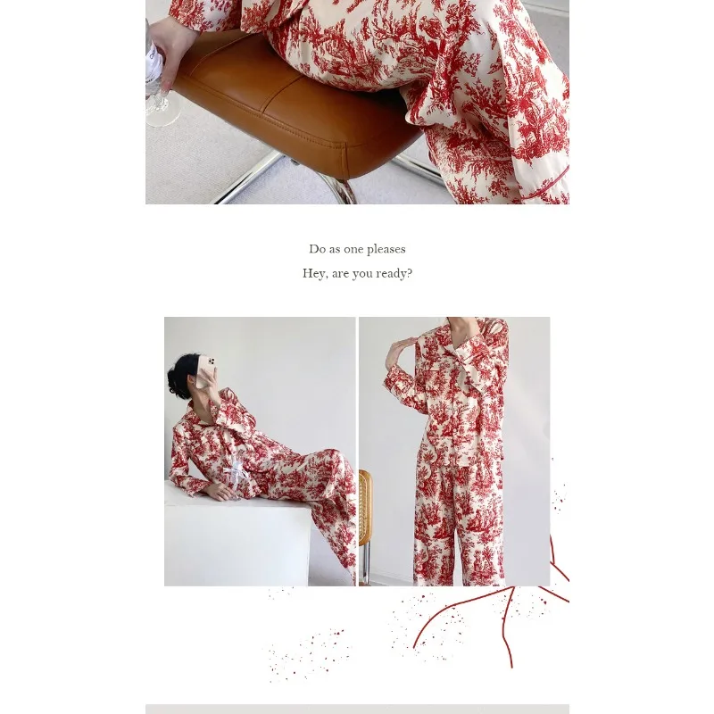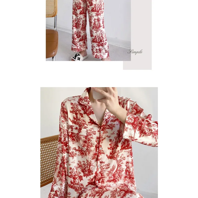 Ensemble pyjama 2 pièces pour femme, tenue de détente, imprimé floral rouge, manches longues, pantalon, vêtements de nuit amples en satin, chemise et pantalon
