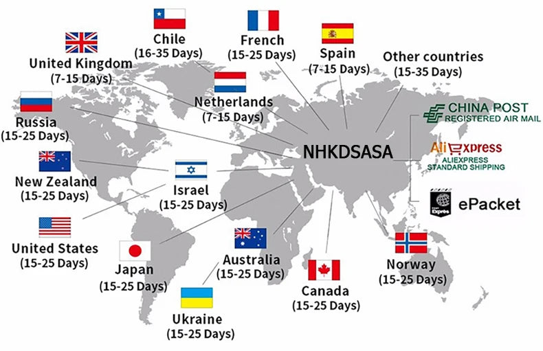 4. Les articles sont expédiés par AliExpress Standard Shipping, AliExpress Saver Shipping et ePacket. Le délai de livraison est de 15 à 35 jours ouvrés dans la plupart des pays. Le délai de livraison dépend de la destination et d'autres facteurs, et peut aller jusqu'à 60 jours ouvrés.